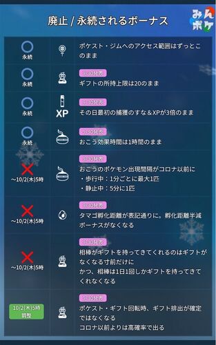 ども 10月からコロナ対策に大きな変更が入ると言う事で朝からまとめてましたが、みんポケさんに上がってたので貼っておきます。 こっちの方が見やすい(笑) 変更廃止(10/2~) ・タマゴ距離1/2 → 元に戻る ・相棒からのギフトが1日1回(たぶん空になると毎…